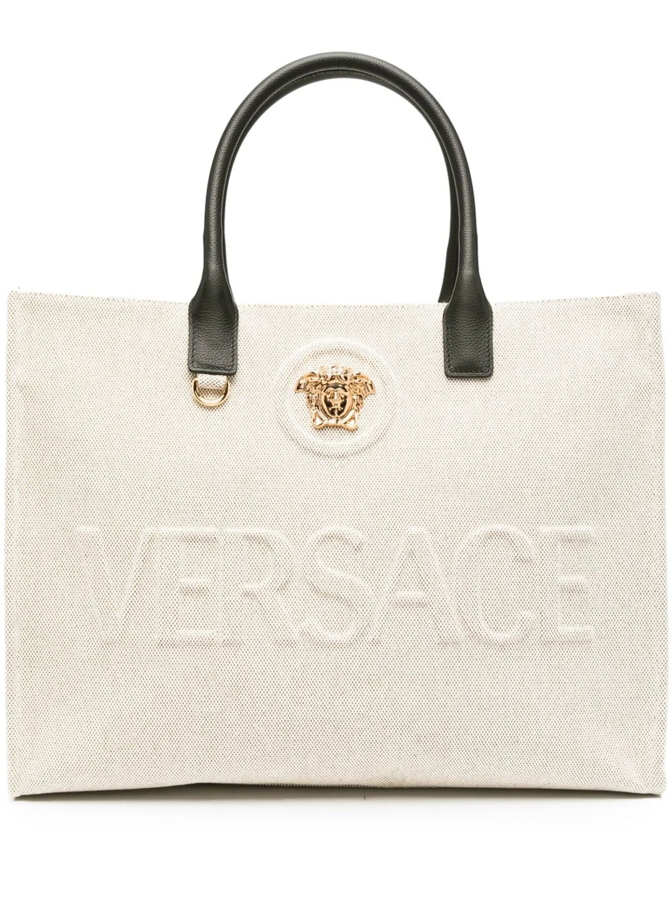 Crafted from cream canvas, the La Medusa tote is part of Versace's SS22 collection and adorned with an iconic Medusa head motif at the front. Complete with black leather top handles, this spacious accessory is adorned with an embossed logo at the front.